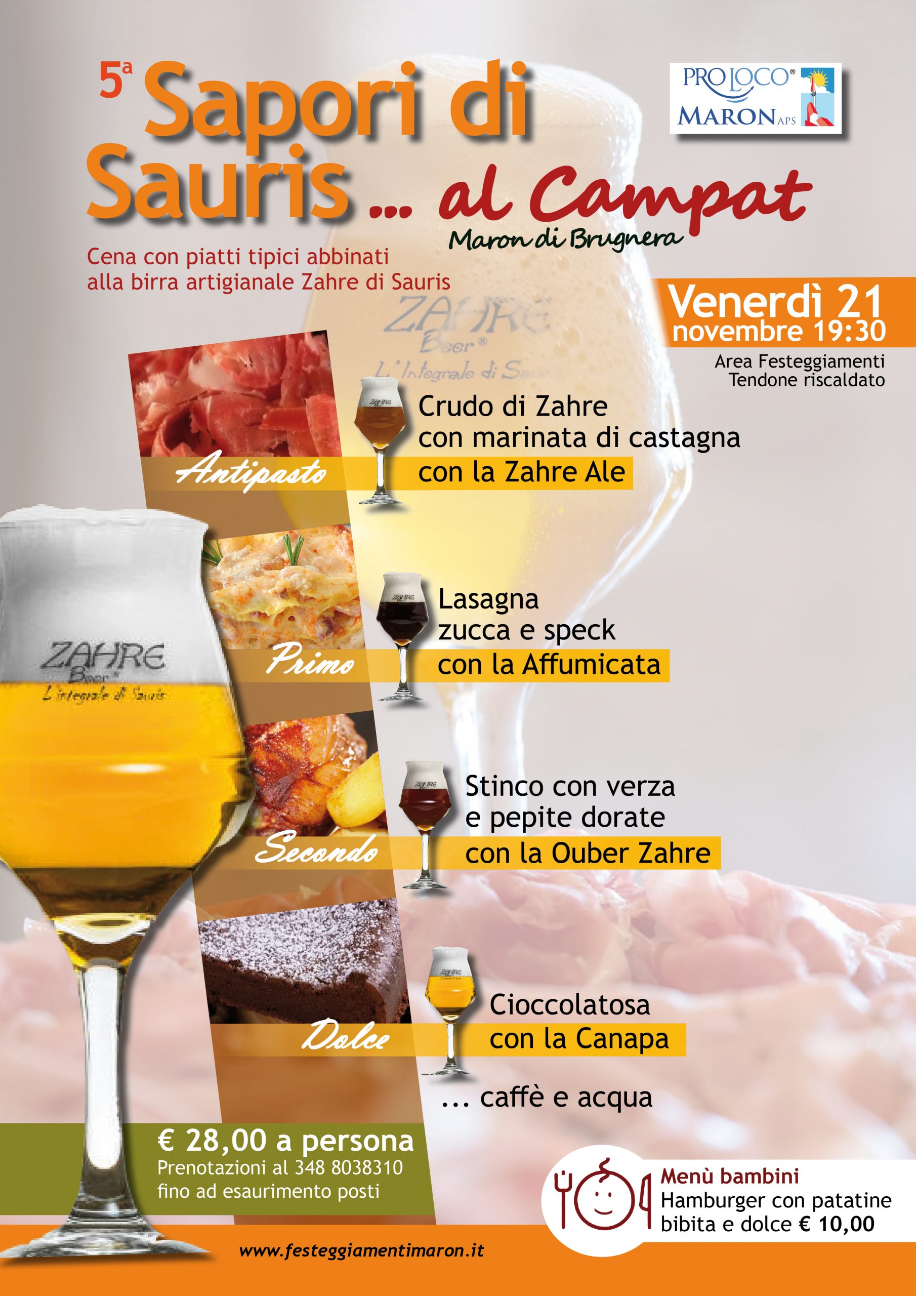 Ogni portata verrà abbinata ad una Birra Zahre di Sauris … acqua e caffè. € 28,00 a persona